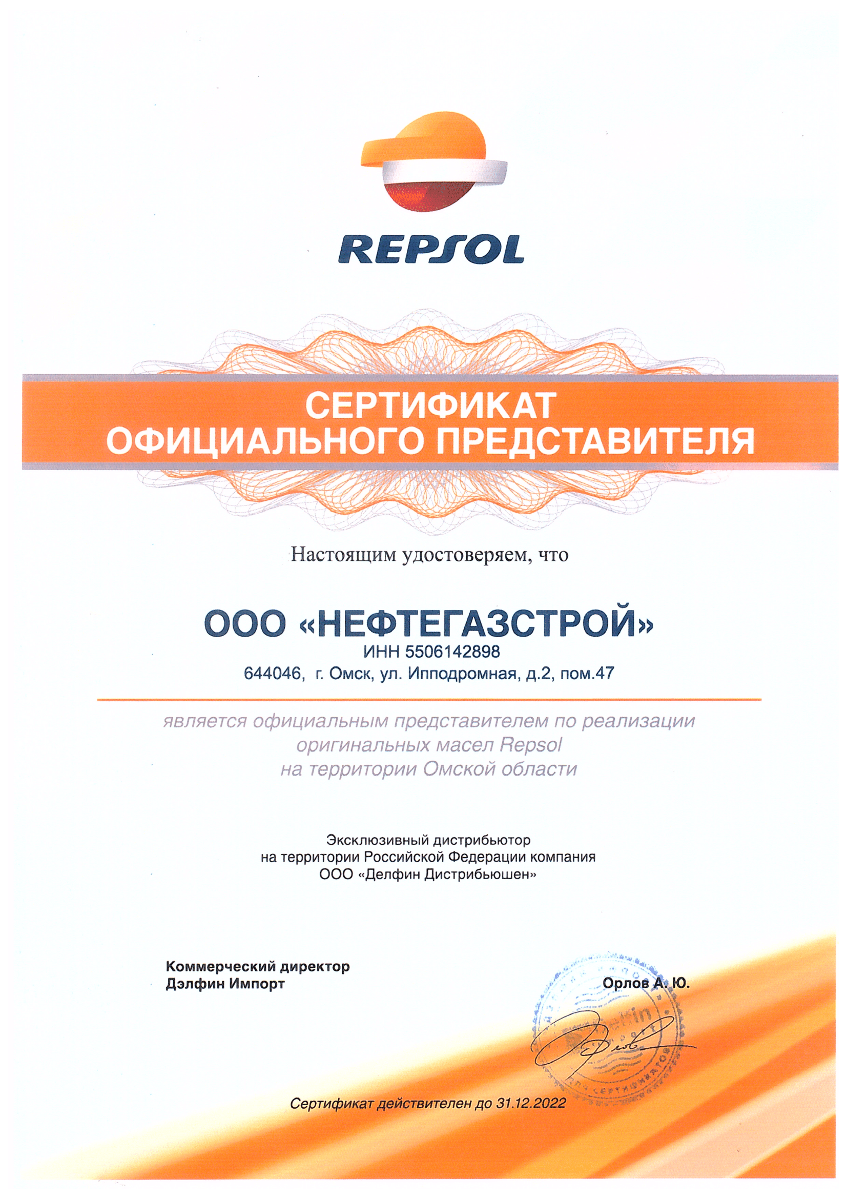 Компания ООО "Нефтегазстрой" является официальным представителем по реализации оригинальных масел Repsol на территории Омской области и гарантирует подлинность и качество продукции.